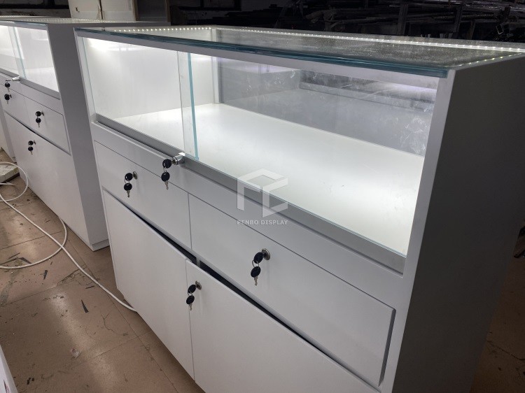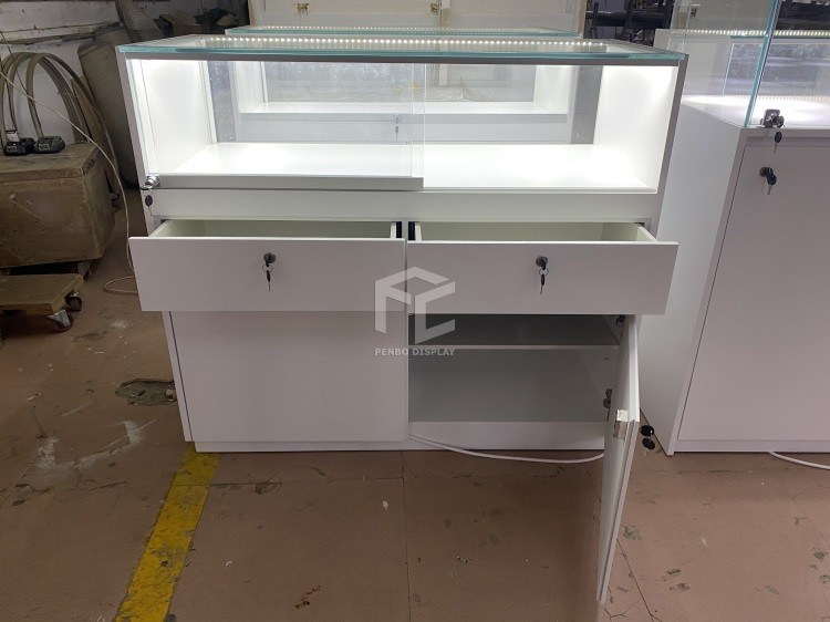 As mostras são feitas pelo vidro moderado ultra branco com a porta deslizante e os fechamentos de vidro para indicar para dentro os produtos. Há duas gavetas na parte traseira do contador e em um armazenamento na parte inferior.