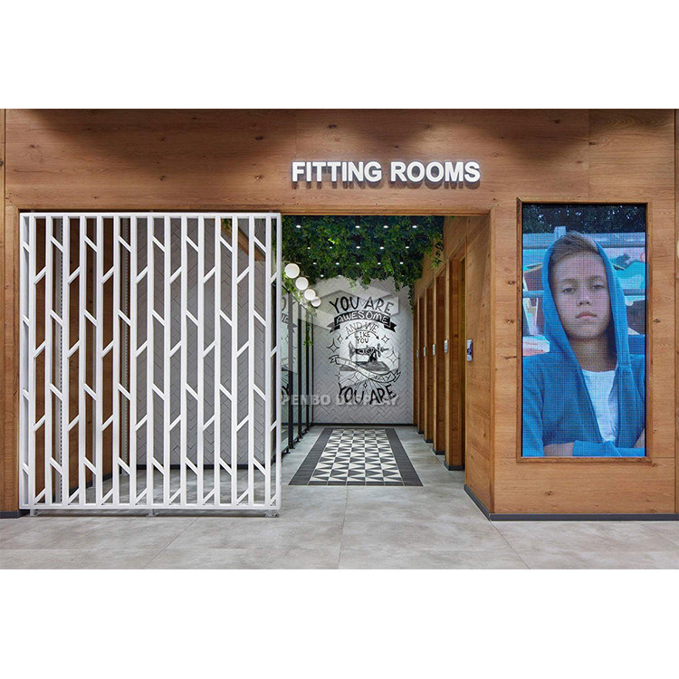 Para este projeto da loja: Material principal: Ferro com powdercoating, vidro moderado ultra claro, logotipo de aço inoxidável, acrílico e madeira compensada à prova de fogo etc.